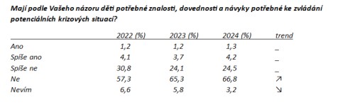 Občané vědí, že děti nejsou schopné se v krizových situacích postarat samy o sebe či pomoct svým blízkým, a evidentně chtějí, aby se tento nelichotivý stav změnil k lepšímu. Z uvedených dat lze usoudit, že aby rodičovské úsilí bylo v tomto směru efektivní a vedlo ke kýženému cíli, bylo by třeba těmto odpovědným rodičům nějak pomoct. Na to, kdo by jim tuto pomocnou ruku mohl a měl nabídnout, se podíváme příště.