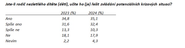 Zajímavá je ale velká skupina odpovědných a realitu respektujících rodičů (více než dvě třetiny), kteří deklarují, že svoje děti učí řešit krizové situace, což je určitě skvělé a chvályhodné.