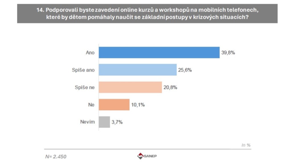 Zdroje dat: Středisko analýz a empirických průzkumů Sanep, s.r.o.; průzkum na téma Bezpečnostní situace v ČR, reakce na krizové situace, branná výchova. Reprezentativní vzorek dotázaných respondentů 18+ (2 450) odpovídal sociodemografickému rozložení obyvatel ČR dle údajů ČSÚ, statistická odchylka ±1,5 %.
