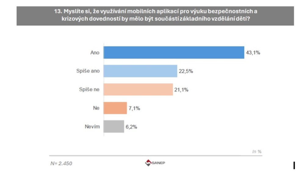 Dvě třetiny občanů se domnívají, že ke zlepšování schopností dětí řešit složité bezpečnostní situace by měla přispívat i školní výuka prostřednictvím mobilních aplikací. Kdybychom chtěli toto většinové přání prakticky zrealizovat, museli bychom vyřešit celou řadu souvisejících okolností a problémů. Mají dnes všechny děti k dispozici chytrý telefon? Jsou učitelé ochotni a schopni realizovat tyto moderní formy výuky? Je používání chytrých telefonů při vyučování centrálně dovoleno? Shodnou se odborníci z mnoha oborů na obsahu a formě takových aplikací? Atd., atd…