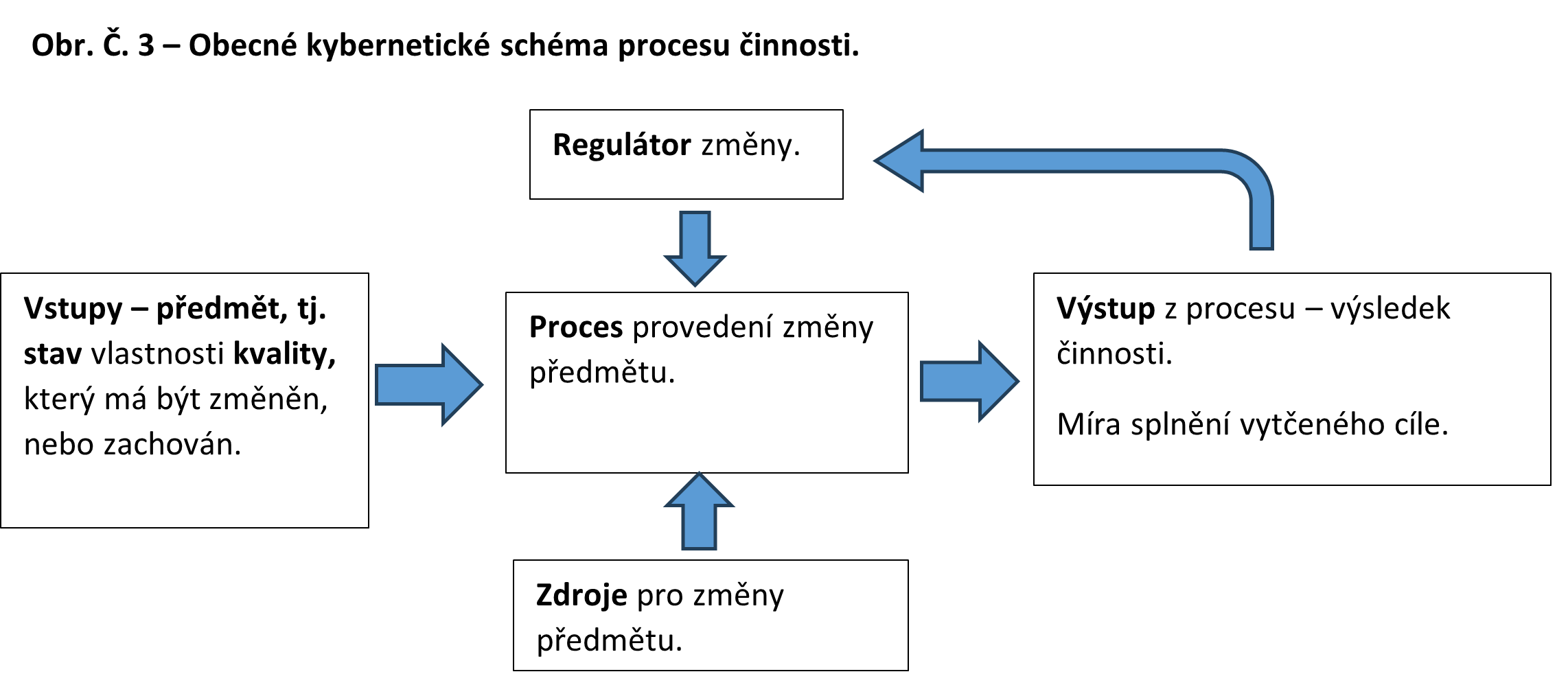 Na obrázku č. 3 je obecné kybernetické schéma, které popisuje průběh uspokojení potřeby a dosažení účelu. Samotná potřeba a účel se v tomto schématu nevyskytují. Schéma začíná zvoleným předmětem působení činnosti a končí dosažením výsledku. U výsledku musíme vidět dva prvky – jednak stanovený ideální cíl, jak má být předmět změněn, a jak byl potom změněn ve skutečnosti.
