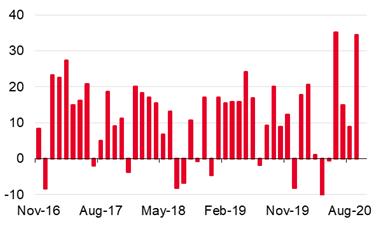 Silný výsledek tuzemského zahraničního obchodu za září jenom podtrhuje rychlé oživení ekonomiky ve třetím čtvrtletí. To již naznačil předběžný odhad HDP za třetí kvartál zveřejněný před týdnem. Ten ukázal na mezičtvrtletní růst ve výši 6,2 %, čímž opět výrazně překonal tržní konsensus. Vývoj jednoznačně odpovídal růstovému profilu ostrého V, kdy po výrazném propadu během druhého čtvrtletí v souvislostí s jarní pandemií koronaviru přišel ve třetím čtvrtletí rychlý obrat k lepšímu.