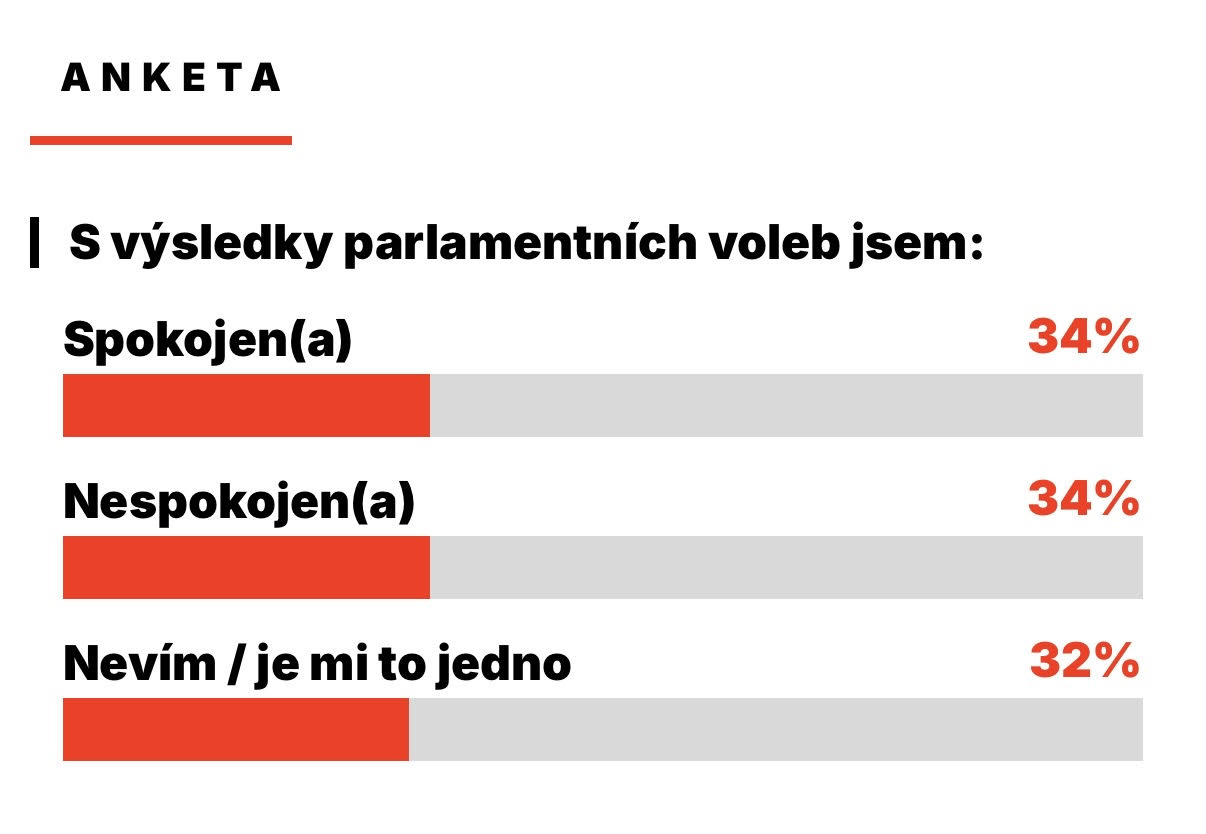 Anketa serveru První zprávy, které se od 4. - 8. října účastnilo 75.942 čtenářů, ukazuje pozoruhodně vyrovnaný obrázek nálad. S výsledky parlamentních voleb je spokojeno 34 % hlasujících, nespokojenost vyjadřuje rovněž 34 % a 32 % respondentů volí odpověď nevím nebo je mi to jedno. Tři přibližně stejně velké skupiny naznačují hluboké rozdělení obyvatel a současně to, že výrazná část lidí výsledek bere s odstupem a bez silné emoce. Tento trojitý obraz připomíná, jak těsně a proměnlivě se závěr volební kampaně odehrál.