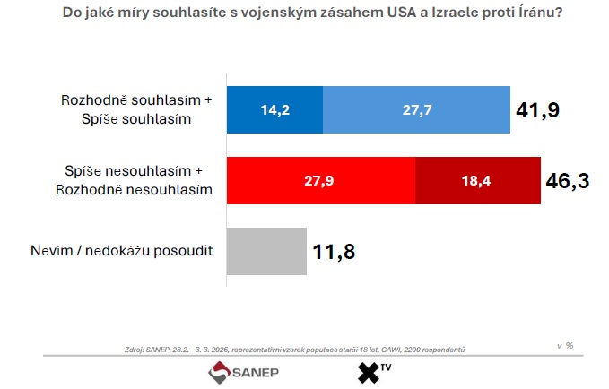 Nový průzkum agentury SANEP ukazuje, že většina Čechů nesouhlasí s vojenským útokem USA a Izraele proti Íránu. Výsledky odhalují hlubokou nedůvěru veřejnosti k eskalaci konfliktu.