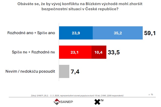 Podle exkluzivního průzkumu agentury SANEP pro XTV se 59,1 procenta respondentů domnívá, že vývoj konfliktu na Blízkém východě může zhoršit bezpečnostní situaci v České republice. Z toho 23,9 procenta odpovědělo rozhodně ano a dalších 35,2 procenta spíše ano. Na opačné straně stojí 33,5 procenta dotázaných, kteří se domnívají, že k žádnému zhoršení nedojde. Zbývajících 7,4 procenta respondentů uvedlo, že situaci nedokáže posoudit.